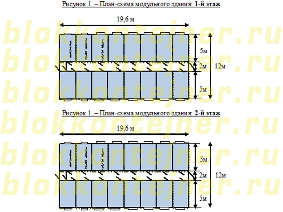 Модульное здание «Общежитие» на 300 человек    в 2-этажа, размер: (51,45 *12,0*5,0м) состоит из 84 единиц БК размер 5,0*2,45*2,5м:
